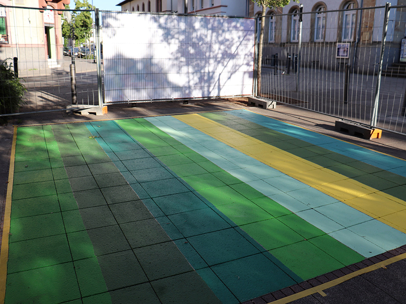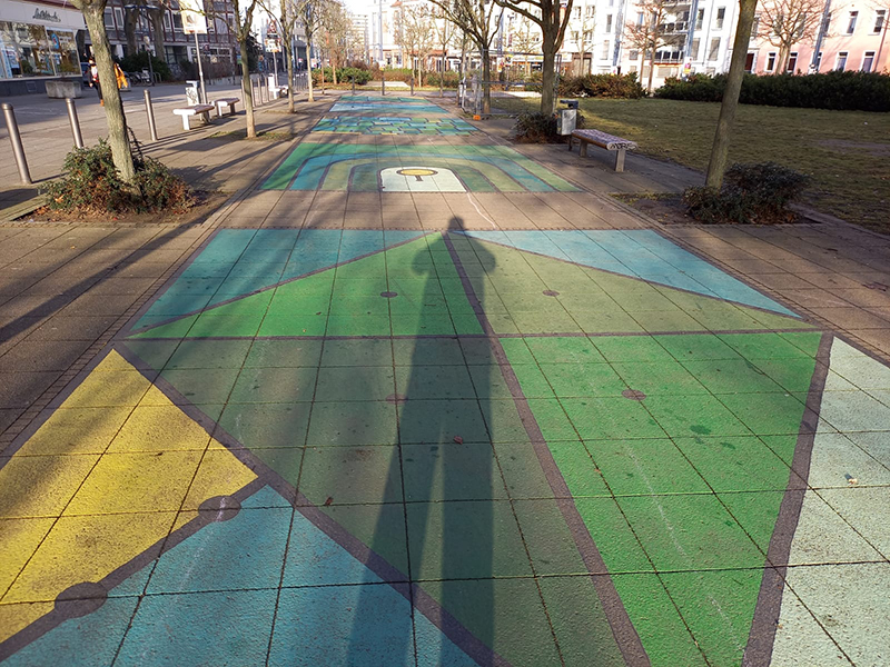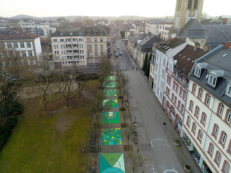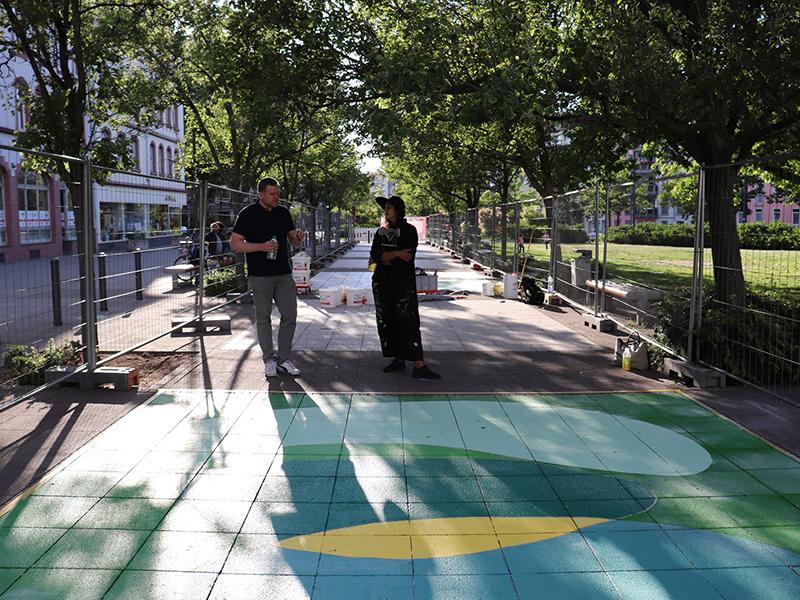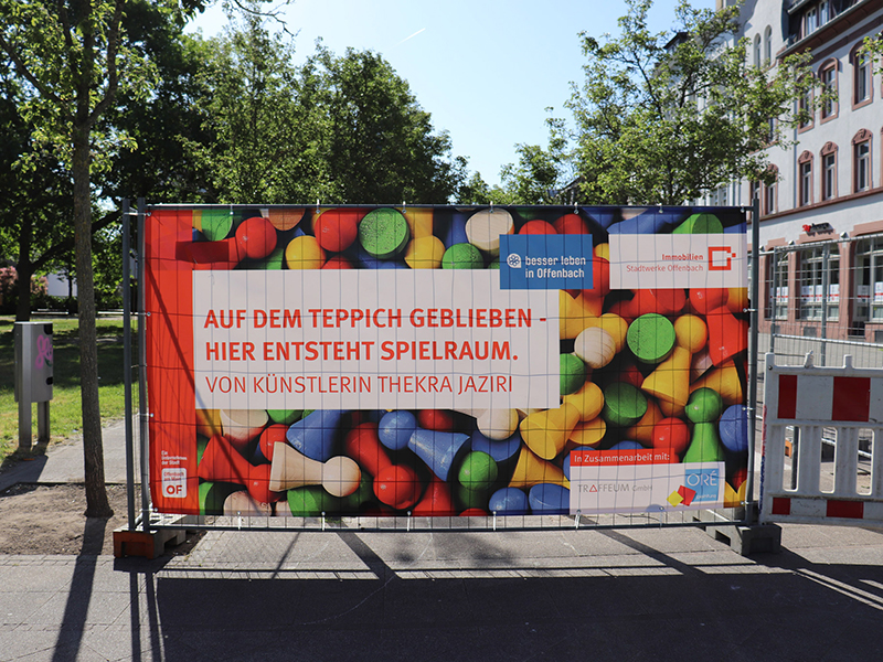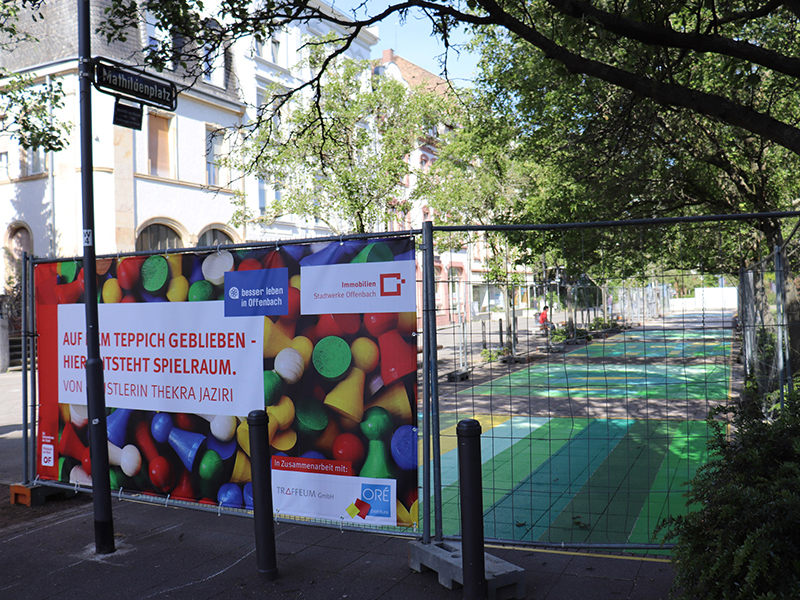 In den nächsten 14 Tagen wird entlang des Mathildenplatzes in Offenbach ein Spielteppich nach einem Entwurf der Street Art Künstlerin Thekra Jaziri entstehen. Der Spielteppich entsteht auf einer Fläche von 65 Metern Länge und fünf Metern Breite und besteht aus acht aneinander gereihten farbigen Rechtecken, die in einem einheitlichen harmonischen Farbkonzept mit geometrischen Formen, "inakkuraten Kurven", Punkten und Streifen gestaltet sind. Im Gegensatz zu vorgefertigten Spielen wie z. B. Himmel und Hölle, soll hier die eigene Kreativität der Kinder angeregt werden.