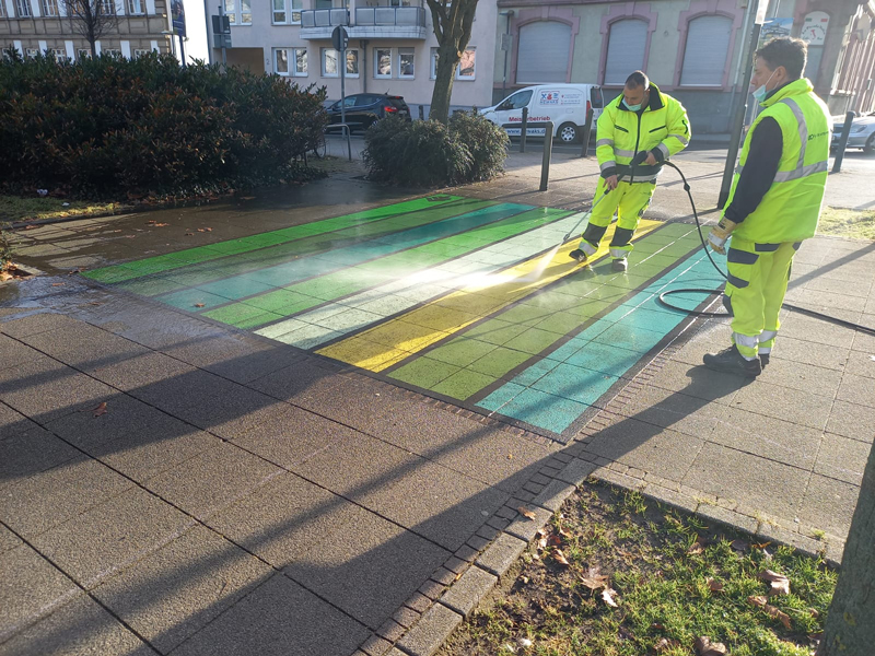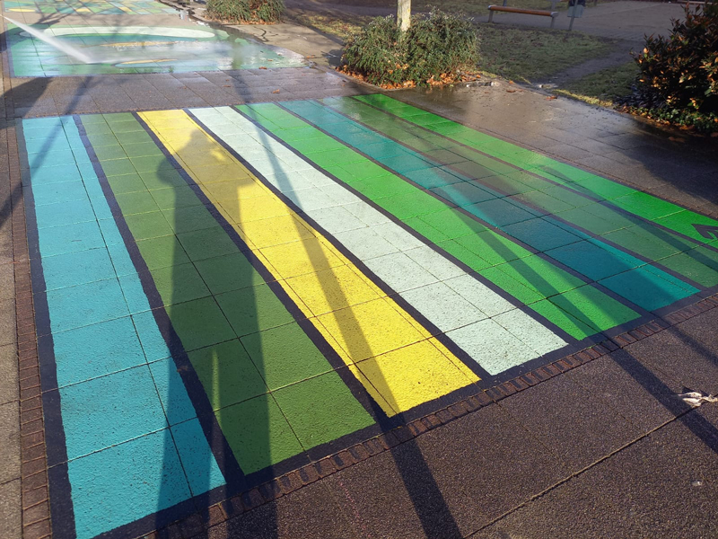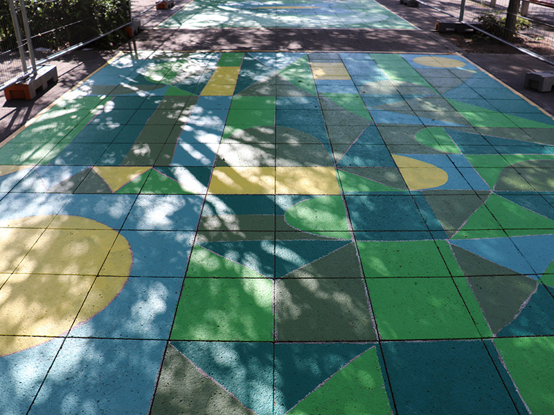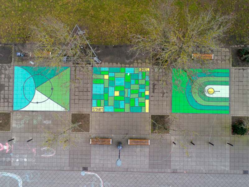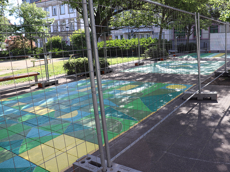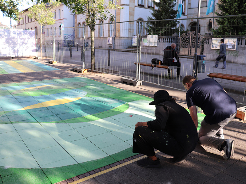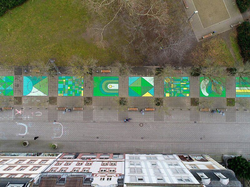 In den nächsten 14 Tagen wird entlang des Mathildenplatzes in Offenbach ein Spielteppich nach einem Entwurf der Street Art Künstlerin Thekra Jaziri entstehen. Der Spielteppich entsteht auf einer Fläche von 65 Metern Länge und fünf Metern Breite und besteht aus acht aneinander gereihten farbigen Rechtecken, die in einem einheitlichen harmonischen Farbkonzept mit geometrischen Formen, "inakkuraten Kurven", Punkten und Streifen gestaltet sind. Im Gegensatz zu vorgefertigten Spielen wie z. B. Himmel und Hölle, soll hier die eigene Kreativität der Kinder angeregt werden.