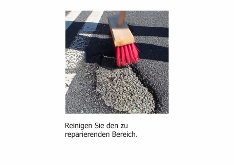 Reinigen Sie die zu reparierende Stelle und erwärmen Sie diese, um Restfeuchtigkeit zu beseitigen. Danach eine Schicht ChipFill® (max. 15 mm) in das Schlagloch bzw. den Riss füllen und mit dem Brenner erhitzen. Dabei wird das Material flüssig und füllt die vorher offene Stelle komplett aus. Eventuell erforderliche weitere Lagen ChipFill® werden genauso appliziert. Dabei sollte aber eine Schichtdicke von insgesamt 45 mm nicht überschritten werden.
